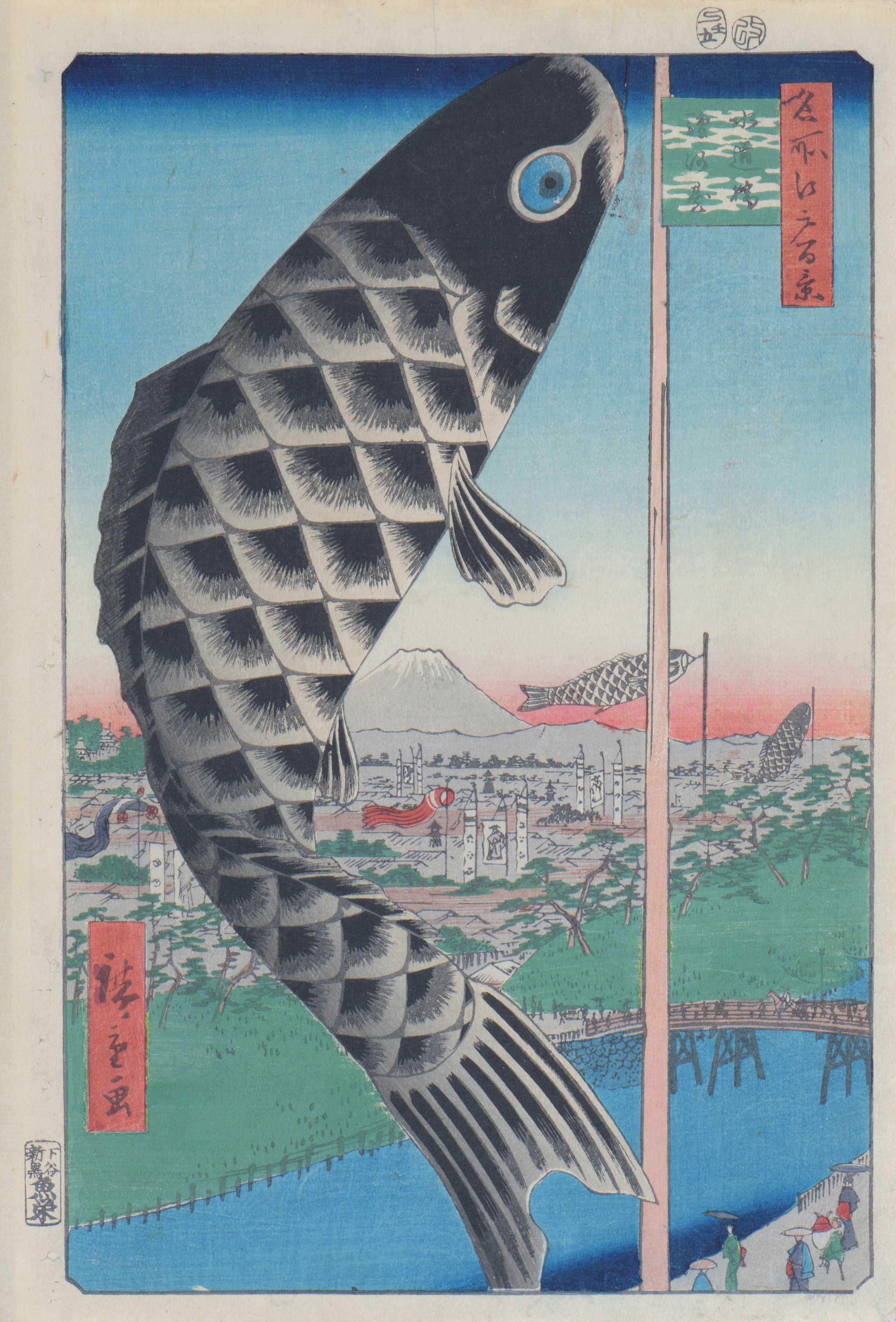 開催中の企画展「広重づくし」では、鯉のぼりがはためく江戸の風景を描いた初代広重の作品をご覧いただけます。