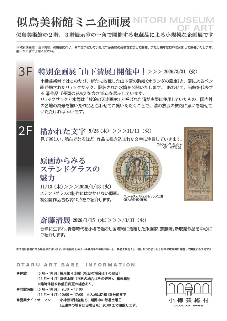 今年度に予定しておりました似鳥美術館ミニ企画展(似鳥美術館の2階、3階展示室の一角で開催する収蔵品による小規模な企画展)は 特別企画展「山下清展」の開催に伴い、会場を変更して開催、または来年度以降に延期して開催いたします。 何卒ご理解ご了承の程よろしくお願いいたします。