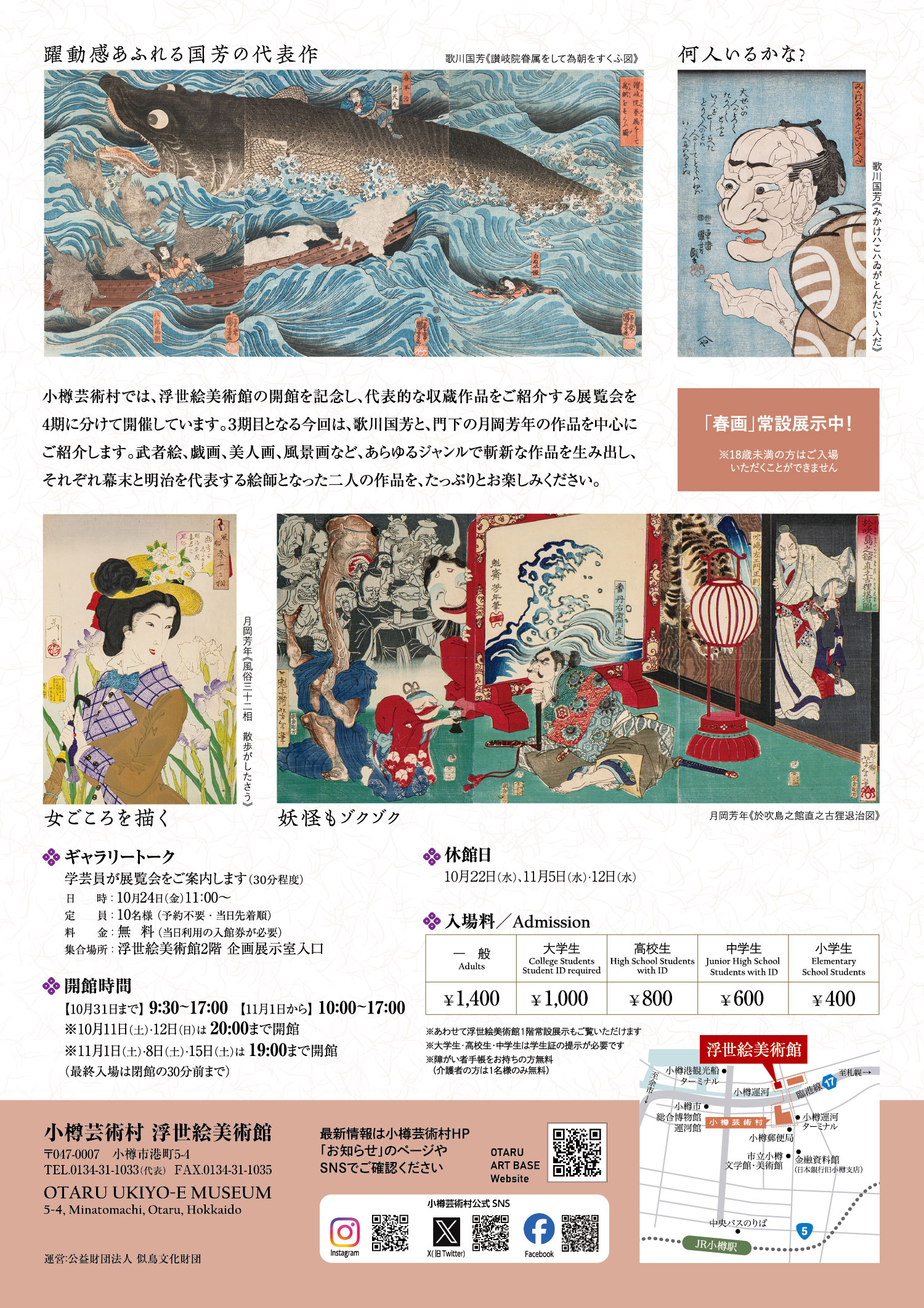 小樽芸術村浮世絵美術館では、10月11日(土)より 開館記念展 コレクション撰Ⅲ「国芳と芳年を中心に」を開催いたします。