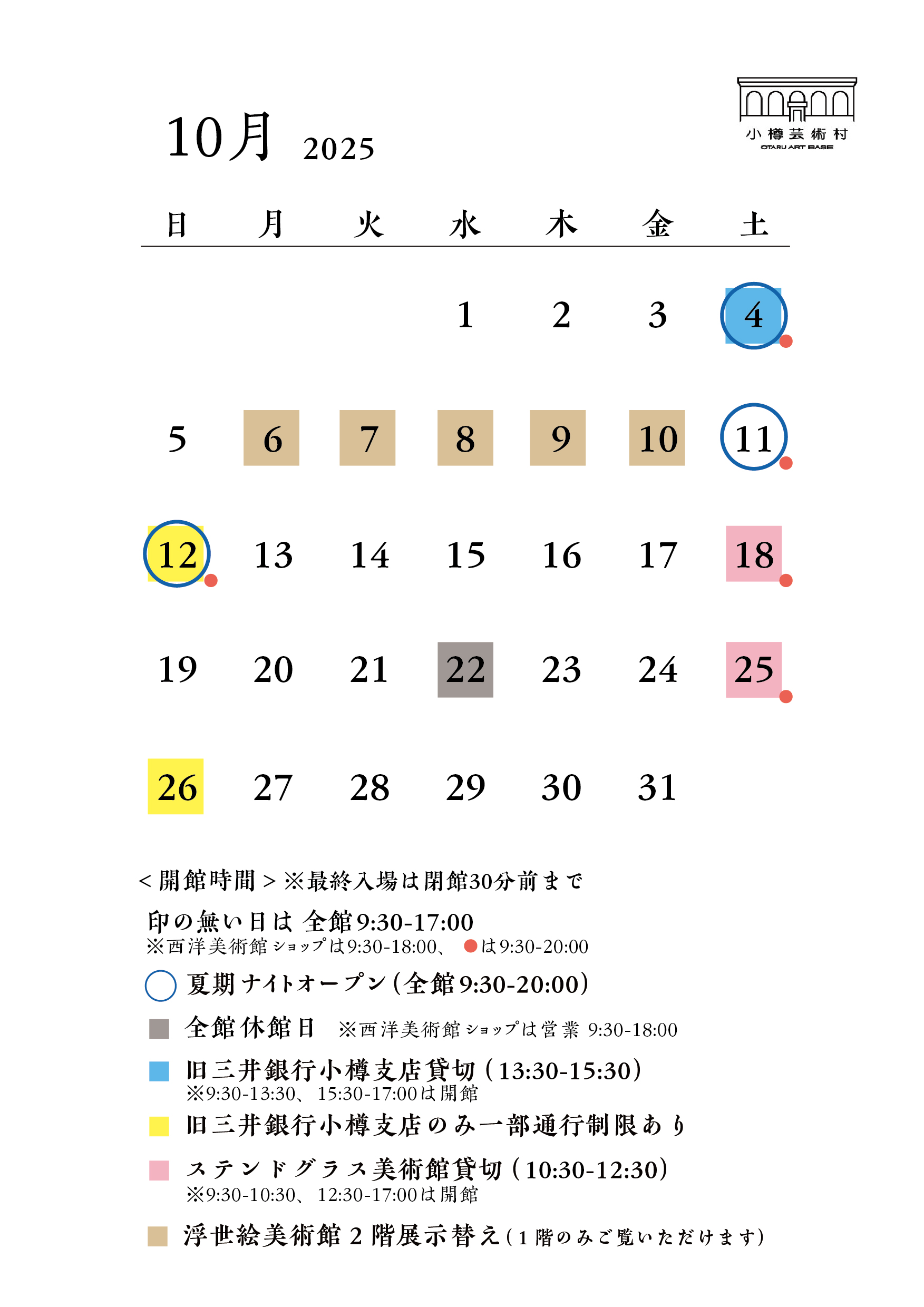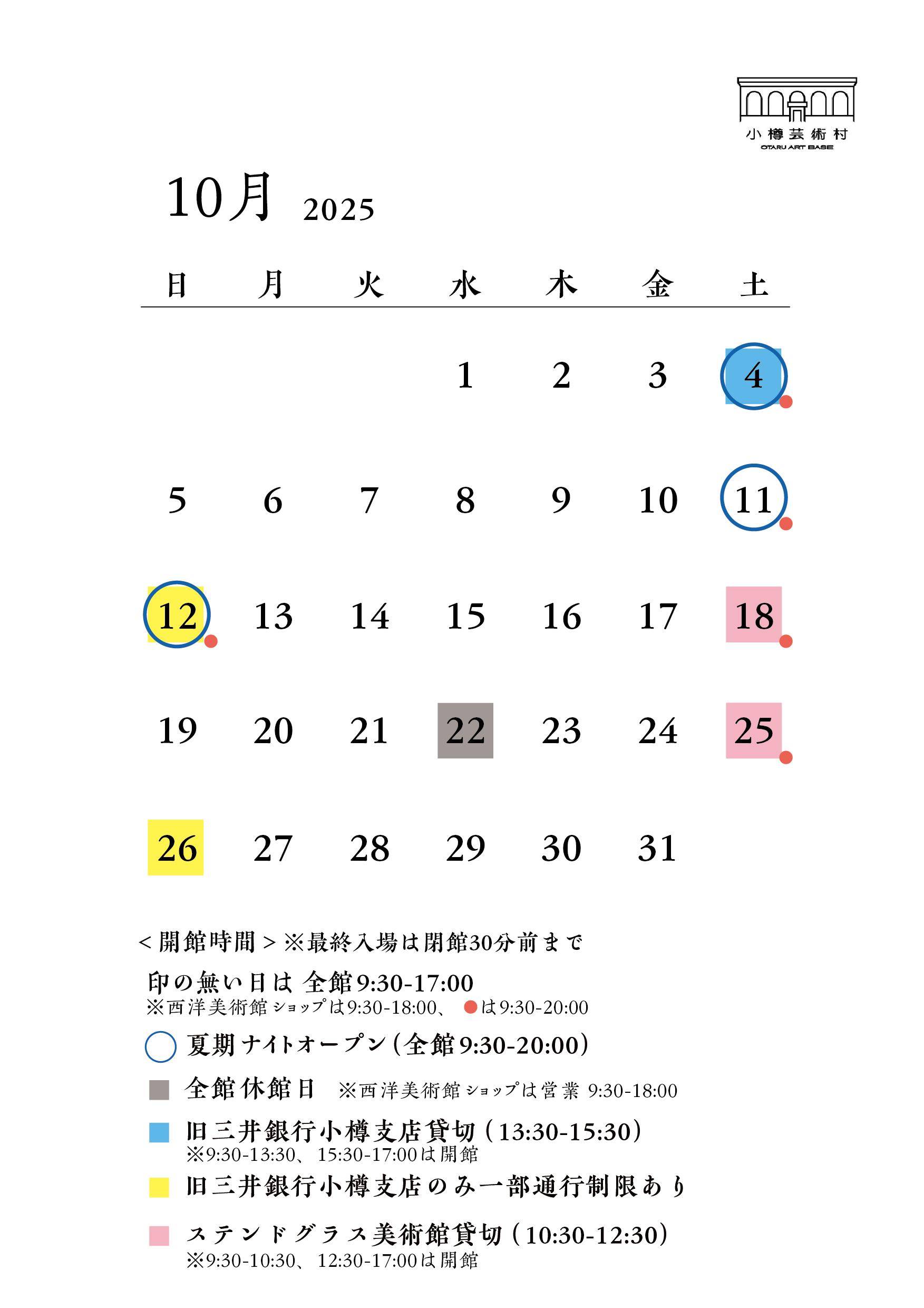7月19日(土)~10月12日(日)の期間中、小樽芸術村全館で、毎週土曜日(三連休の場合は日曜日も)20:00まで開館します。