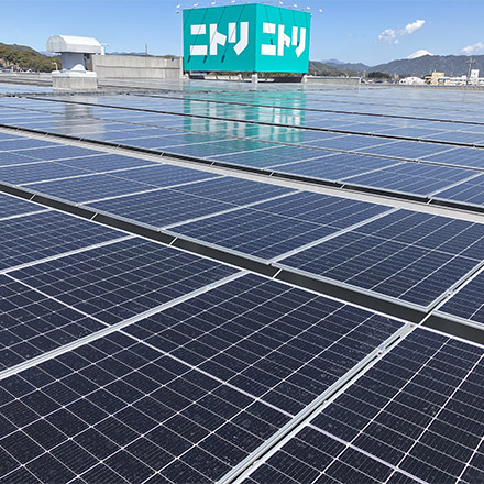 上記の目標達成に向け、再生可能エネルギーの利活用、エネルギー効率の高い電気・ガス設備への入替え、熱遮断性の高い建築方法・建築素材の採用など、複数の施策を進めています。また、これらの温室効果ガス削減につながる設備投資を促進するため、「インターナルカーボンプライシング(ICP:社内炭素価格)」を2023年度から導入し、将来見込まれるカーボンコスト(炭素税・排出量取引等)を踏まえた投資判断を行っています。再生可能エネルギーの利活用につきましては、一部ニトリ店舗にて太陽光発電の稼働を開始いたしました。